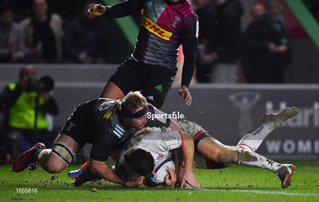 13 December 2019; John Cooney of Ulster dives over to score his side's first try, despite the tackle of James Chisholm of Harlequins, during the Heineken Champions Cup Pool 3 Round 4 match between Harlequins and Ulster at Twickenham Stoop in London, England. Photo by Seb Daly/Sportsfile