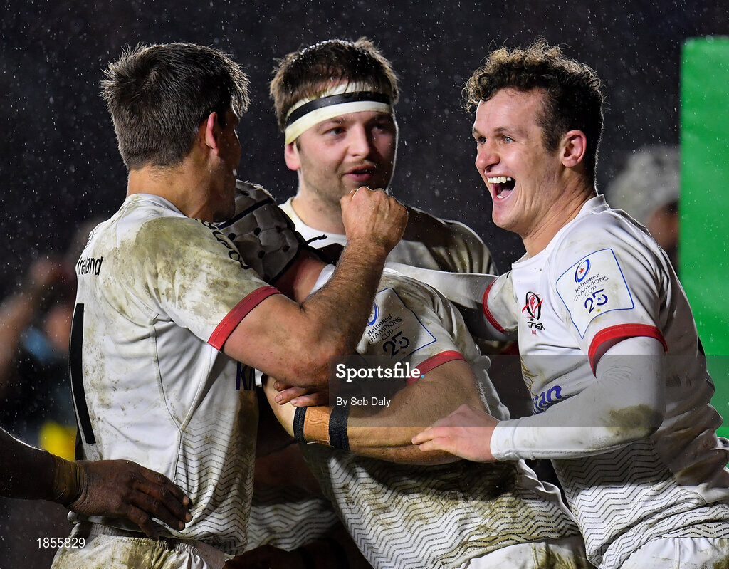 13 December 2019; Luke Marshall of Ulster, centre, is congratulated by team-mates, from left, Louis Ludik, Iain Henderson and Billy Burns, after scoring his side's second try during the Heineken Champions Cup Pool 3 Round 4 match between Harlequins and Ulster at Twickenham Stoop in London, England. Photo by Seb Daly/Sportsfile