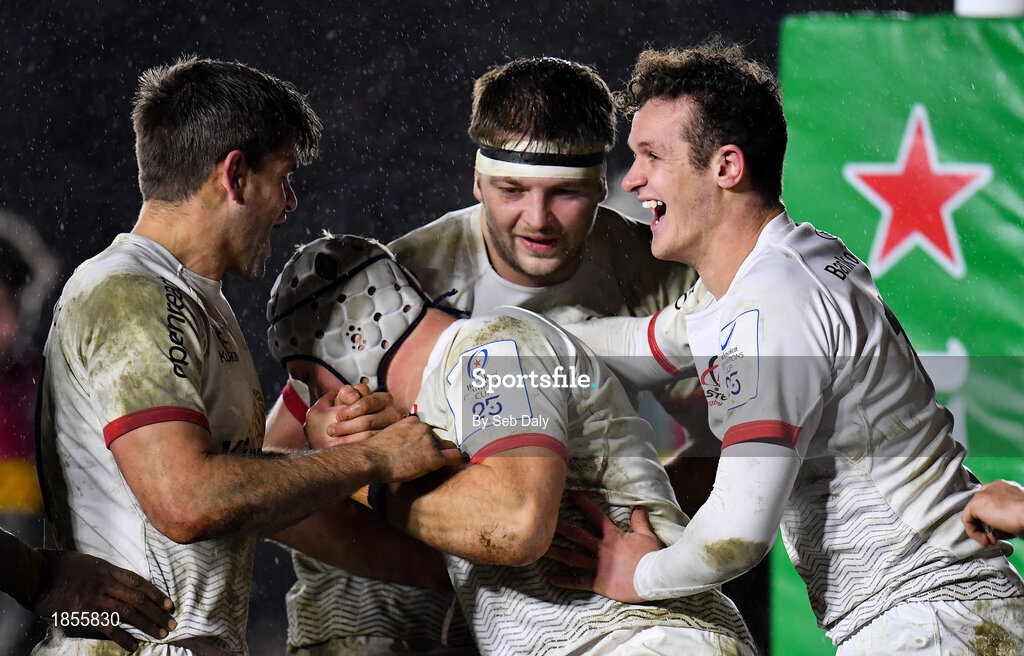 13 December 2019; Luke Marshall of Ulster, centre, is congratulated by team-mates, from left, Louis Ludik, Iain Henderson and Billy Burns, after scoring his side's second try during the Heineken Champions Cup Pool 3 Round 4 match between Harlequins and Ulster at Twickenham Stoop in London, England. Photo by Seb Daly/Sportsfile