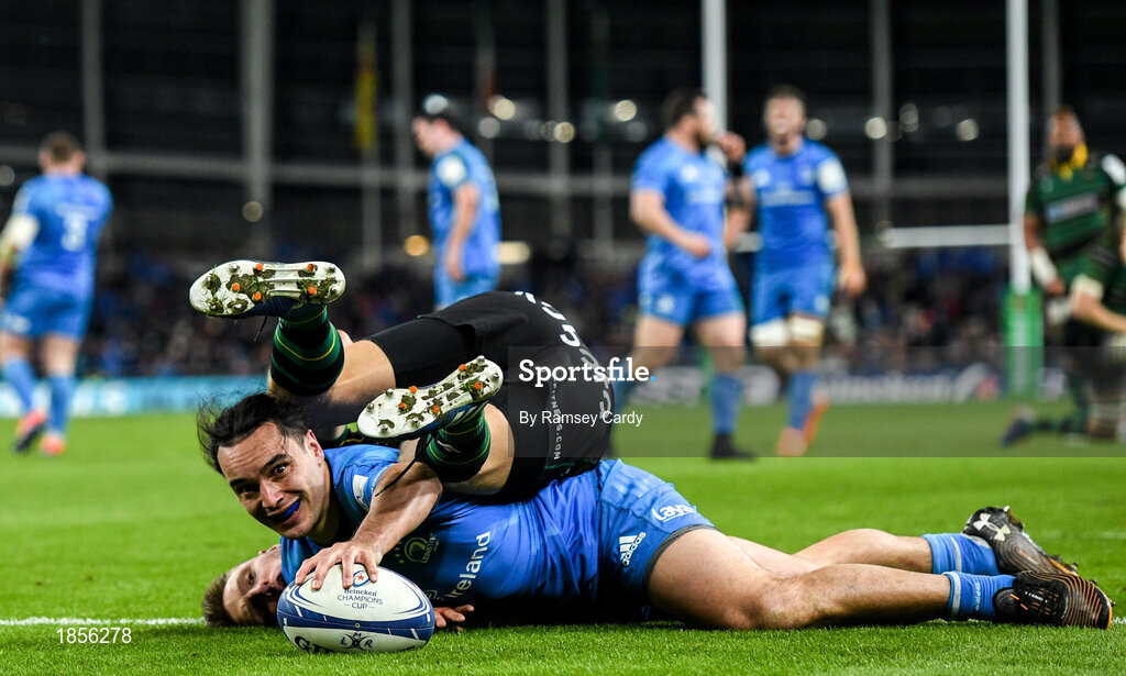 14 December 2019; James Lowe of Leinster scores his side's fifth try despite the tackle of Dan Biggar of Northampton Saints during the Heineken Champions Cup Pool 1 Round 4 match between Leinster and Northampton Saints at the Aviva Stadium in Dublin. Photo by Ramsey Cardy/Sportsfile