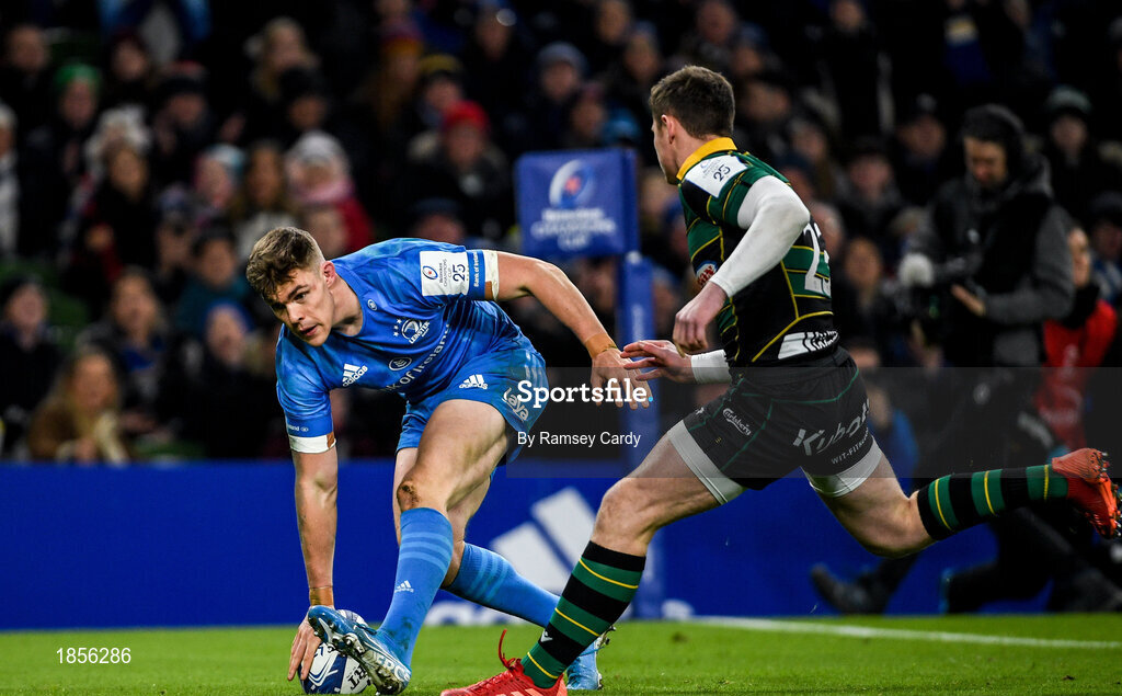 14 December 2019; Garry Ringrose of Leinster scores his side's sixth try during the Heineken Champions Cup Pool 1 Round 4 match between Leinster and Northampton Saints at the Aviva Stadium in Dublin. Photo by Ramsey Cardy/Sportsfile