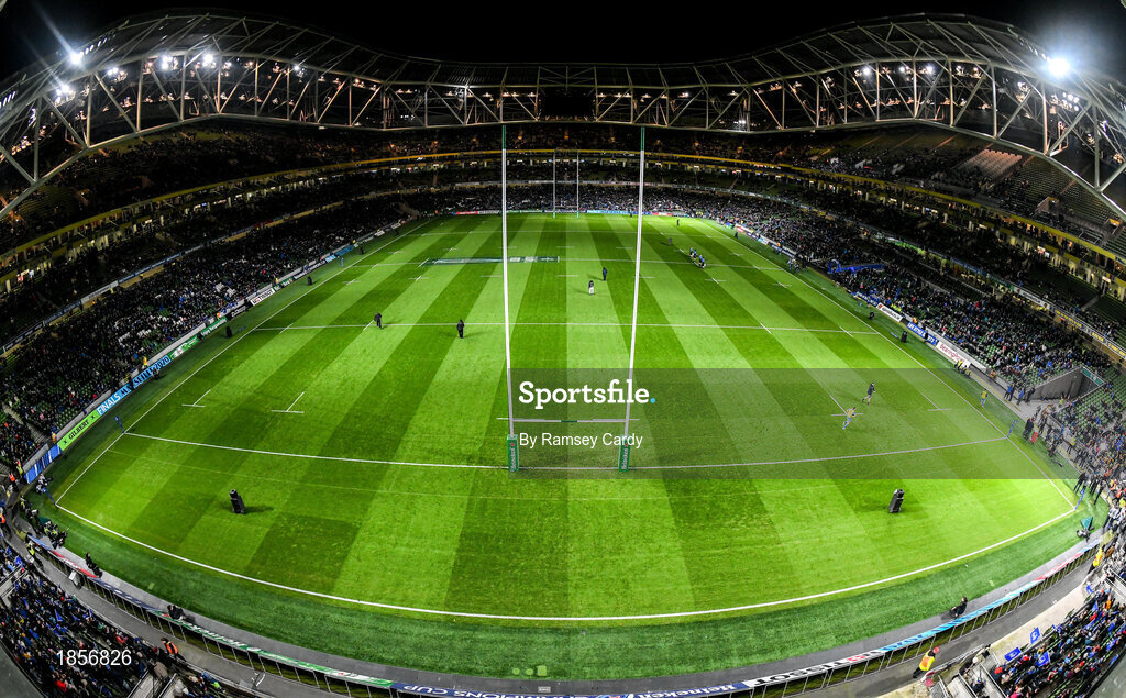 14 December 2019; A general view during a light show at the Heineken Champions Cup Pool 1 Round 4 match between Leinster and Northampton Saints at the Aviva Stadium in Dublin. Photo by Ramsey Cardy/Sportsfile