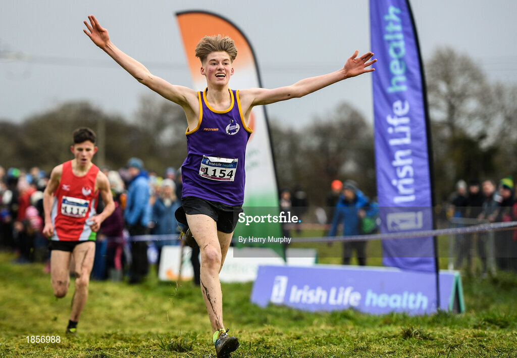 15 December 2019; Myles Hewlett of United Striders A.C., Co. Wexford, celebrates on his way to winning the U15 Boy's 3500m during the Irish Life Health Novice & Juvenile Uneven XC at Cow Park in Dunboyne, Co. Meath. Photo by Harry Murphy/Sportsfile
