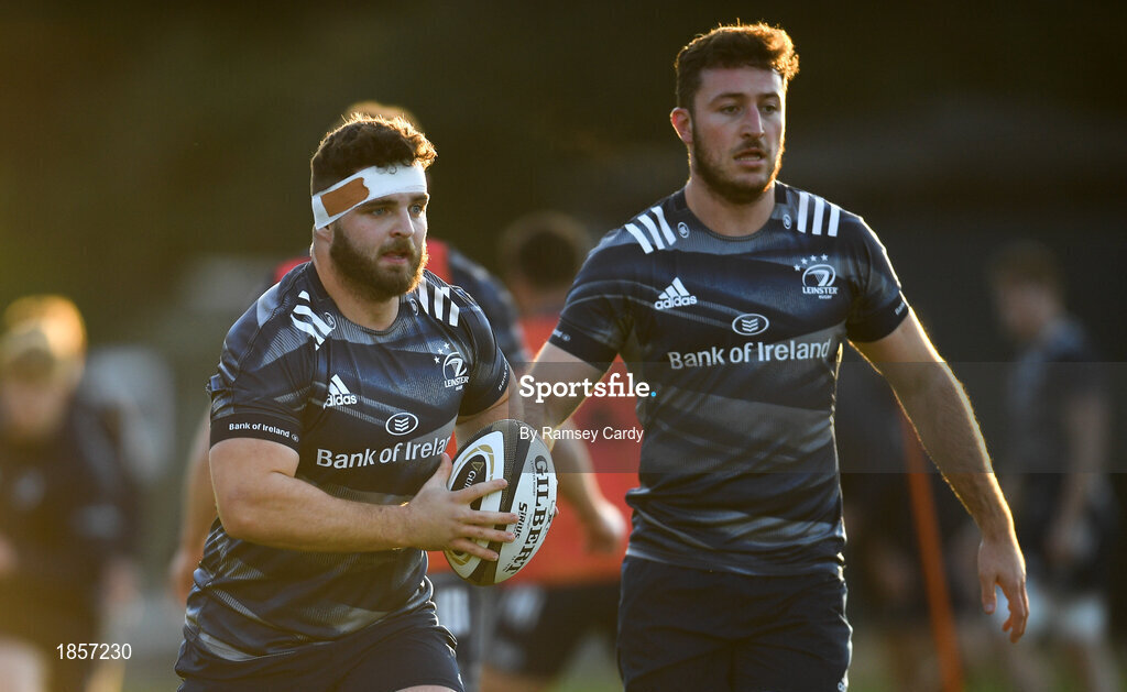 16 December 2019; Michael Milne, left, and Will Connors during Leinster Rugby squad training at UCD, Dublin. Photo by Ramsey Cardy/Sportsfile