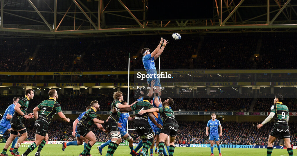 14 December 2019; Caelan Doris of Leinster claims the ball from a line out during the Heineken Champions Cup Pool 1 Round 4 match between Leinster and Northampton Saints at the Aviva Stadium in Dublin. Photo by Sam Barnes/Sportsfile