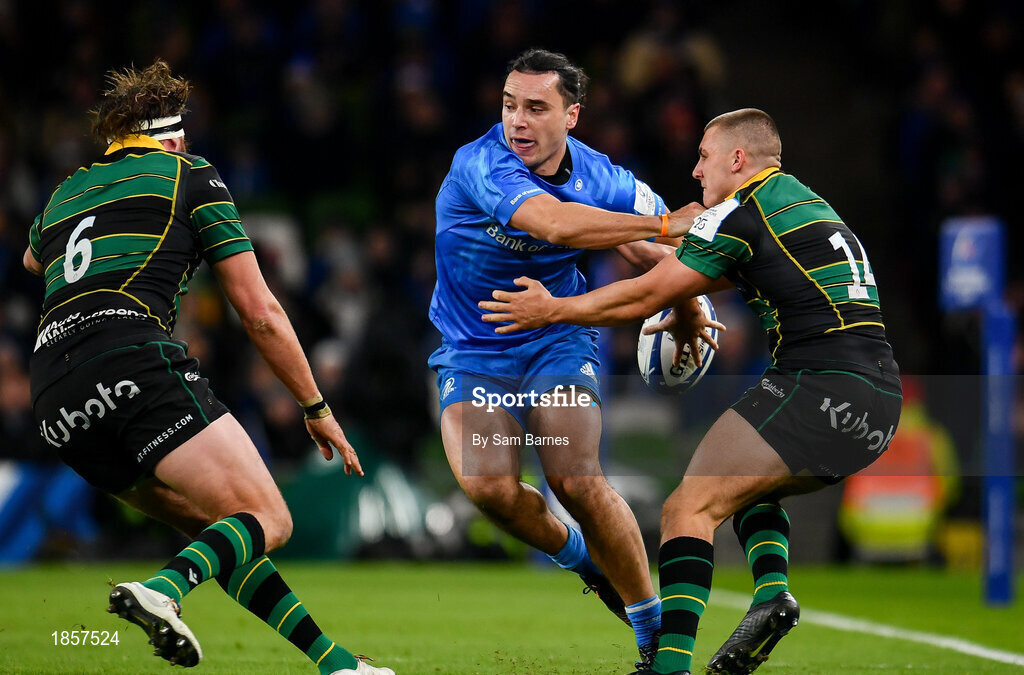 14 December 2019; James Lowe of Leinster in action against Ollie Sleightholme, right, and Tom Wood of Northampton Saints during the Heineken Champions Cup Pool 1 Round 4 match between Leinster and Northampton Saints at the Aviva Stadium in Dublin. Photo by Sam Barnes/Sportsfile