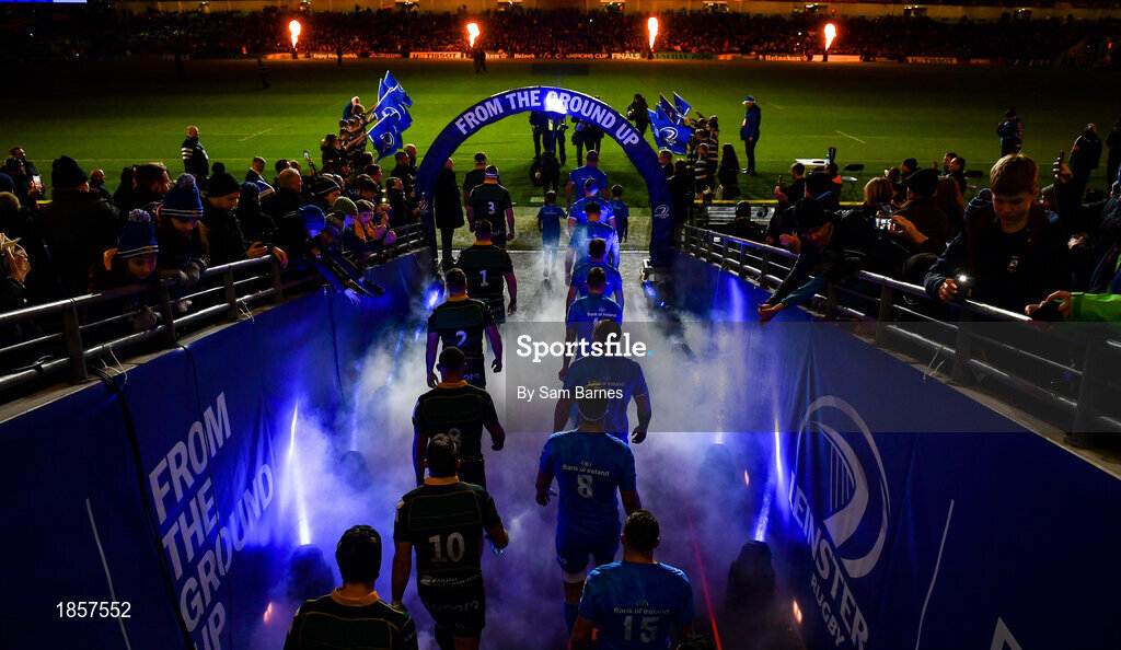 14 December 2019; Players from both sides lead make their way on to the pitch ahead of the Heineken Champions Cup Pool 1 Round 4 match between Leinster and Northampton Saints at the Aviva Stadium in Dublin. Photo by Sam Barnes/Sportsfile