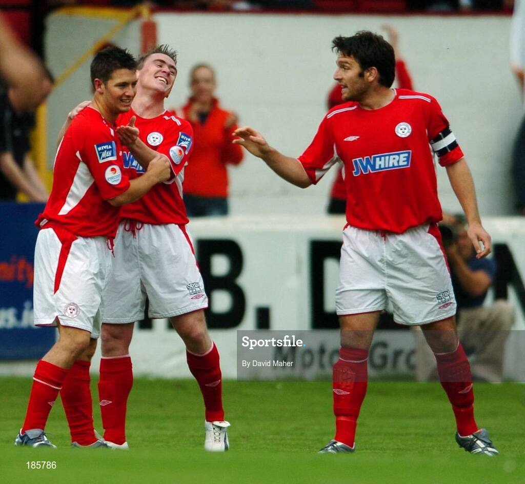 8 August 2005; Wesley Hoolahan, far left, Shelbourne, celebrates after scoring his sides first goal with team-mates Richie Baker, centre, and Stuart Byrne. eircom League, Premier Division, Shelbourne v Drogheda United, Tolka Park, Dublin. Picture credit; David Maher / SPORTSFILE
