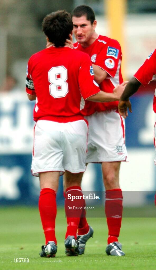 8 August 2005; Stuart Byrne, left, Shelbourne, celebrates with team-mate Colin Hawkins after scoring his sides second goal. eircom League, Premier Division, Shelbourne v Drogheda United, Tolka Park, Dublin. Picture credit; David Maher / SPORTSFILE