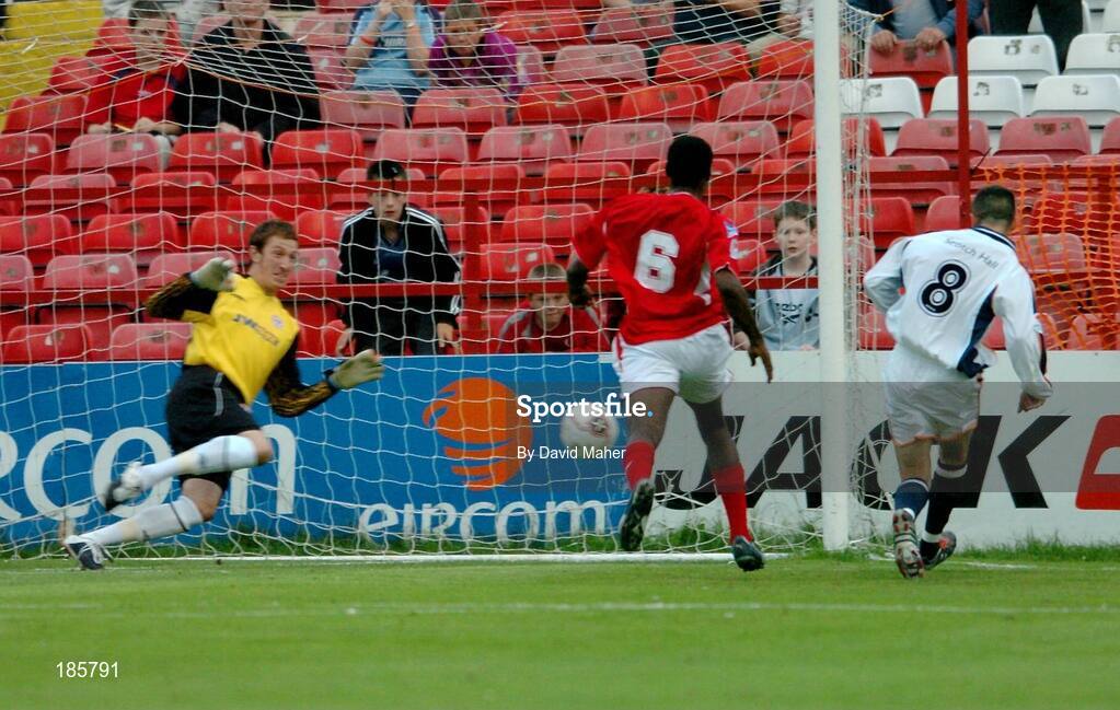 8 August 2005; Keith Fahy, Drogheda United, defeats Joseph Ndo, no.6, and Shelbourne goalkeeper Dean Delaney, to score his sides second goal, Shelbourne. eircom League, Premier Division, Shelbourne v Drogheda United, Tolka Park, Dublin. Picture credit; David Maher / SPORTSFILE