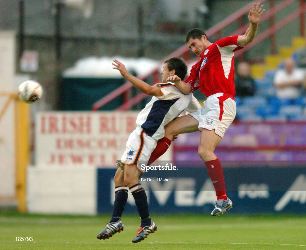 8 August 2005; Colin Hawkins, Shelbourne, in action against Declan O'Brien, Drogheda United. eircom League, Premier Division, Shelbourne v Drogheda United, Tolka Park, Dublin. Picture credit; David Maher / SPORTSFILE