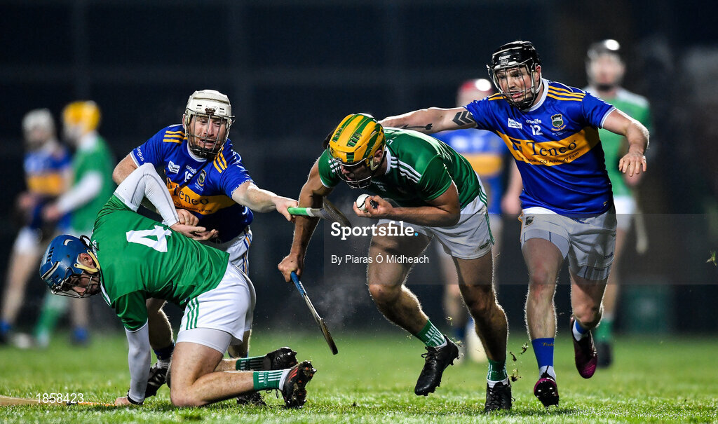 20 December 2019; Dan Morrissey of Limerick, supported by team-mate Aaron Costello, in action against Paul Flynn, left, and Willie Connors of Tipperary during the Co-op Superstores Munster Hurling League 2020 Group A match between Limerick and Tipperary at LIT Gaelic Grounds in Limerick. Photo by Piaras Ó Mídheach/Sportsfile