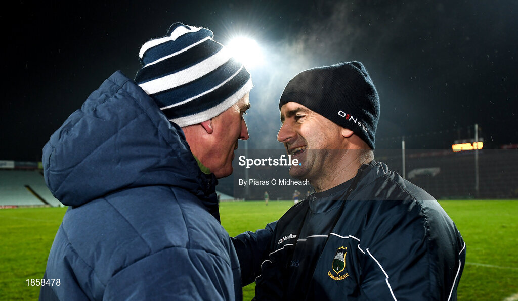 20 December 2019; Tipperary manager Liam Sheedy, right, and Limerick manager John Kiely in conversation after the Co-op Superstores Munster Hurling League 2020 Group A match between Limerick and Tipperary at LIT Gaelic Grounds in Limerick. Photo by Piaras Ó Mídheach/Sportsfile
