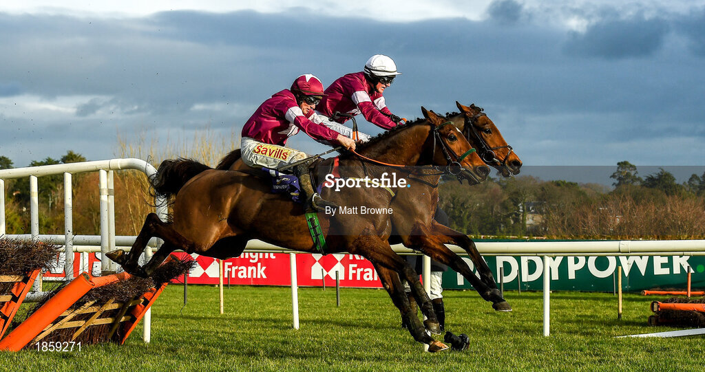 26 December 2019; Accidental Rebel, with Hugh Morgan lead the eventual winner Fauguernon, with Sean Flanagan up, over the last during the Holden Plant Rentals Novice Handicap Hurdle on Day One of the Leopardstown Christmas Festival 2019 at Leopardstown Racecourse in Dublin. Photo by Matt Browne/Sportsfile
