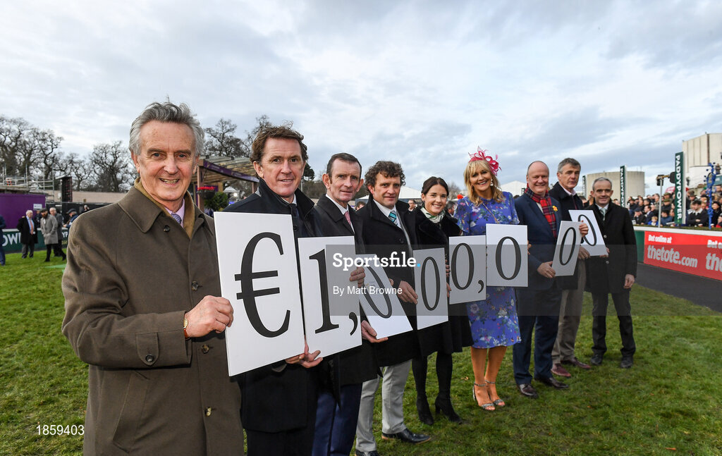 27 December 2019; Leading racehorse trainer Jim Bolger and Champion National Hunt jockey Davy Russell announce that their annual celebrity hurling match, Hurling for Cancer Research, has raised over €1m for the Irish Cancer Society’s cancer research in eight years. They were joined at Leopardstown Christmas Racing Festival by, from left, Jim Bolger, Tony McCoy, Kevin Manning, Paul Nolan, Katie Walsh, Miriam O'Callaghan, Mark Mellett from the Irish Cancer Society, Colm O'Rourke and Ruby Walsh, to celebrate the milestone fundraising goal. Photo by Matt Browne/Sportsfile