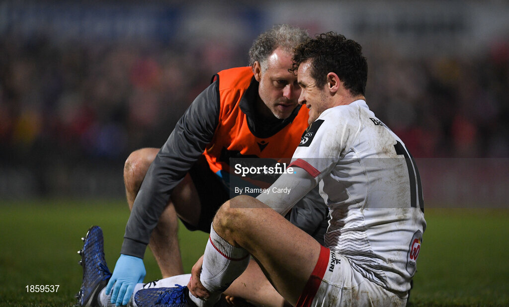 27 December 2019; Billy Burns of Ulster is treated for an injury during the Guinness PRO14 Round 9 match between Ulster and Connacht at the Kingspan Stadium in Belfast. Photo by Ramsey Cardy/Sportsfile