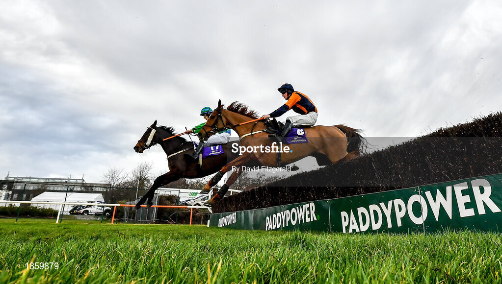 29 December 2019; Best Behaviour, with Barry Browne up, right, jump the last alongside Fiveaftermidnight, with PJ O'Hanlon up, on their way to winning the Tote Supporting Leopardstown Maiden Hurdle during Day Four of the Leopardstown Christmas Festival 2019 at Leopardstown Racecourse in Dublin. Photo by David Fitzgerald/Sportsfile