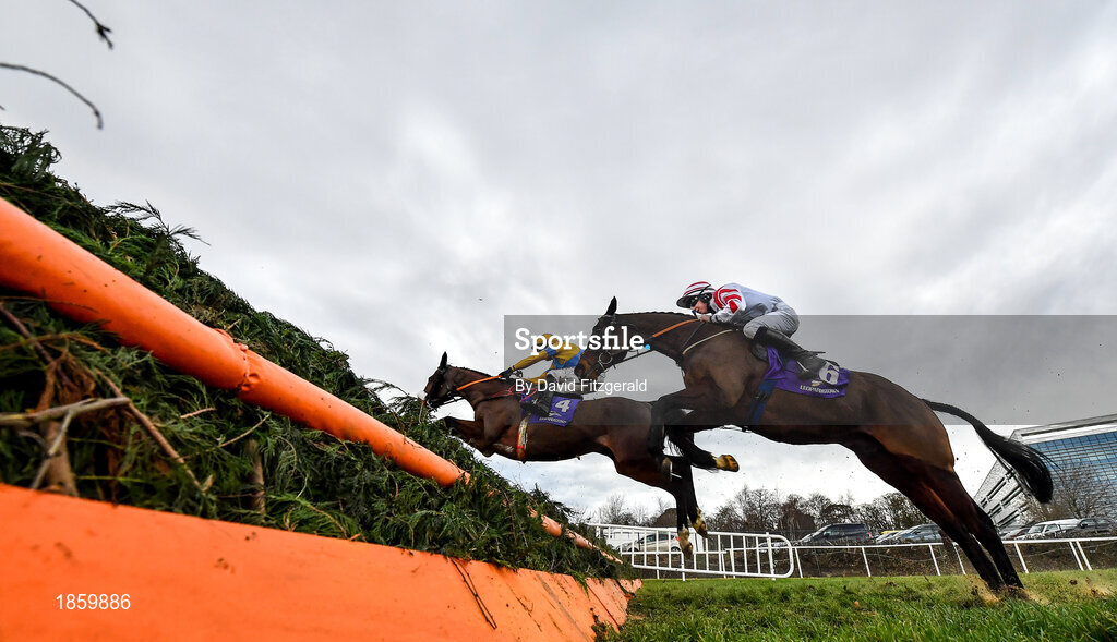 29 December 2019; Brex Drago, with Conor McNamara up, right, and Mindsmadeup, with Adam Short up, jump the last on their first time round during the Tote Supporting Leopardstown Maiden Hurdle during Day Four of the Leopardstown Christmas Festival 2019 at Leopardstown Racecourse in Dublin. Photo by David Fitzgerald/Sportsfile