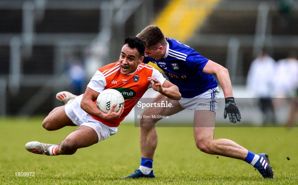 29 December 2019; Jemar Hall of Armagh is tackled by Ryan Connolly of Cavan during the Bank of Ireland Dr McKenna Cup Round 1 match between Cavan and Armagh at Kingspan Breffni in Cavan. Photo by Ben McShane/Sportsfile