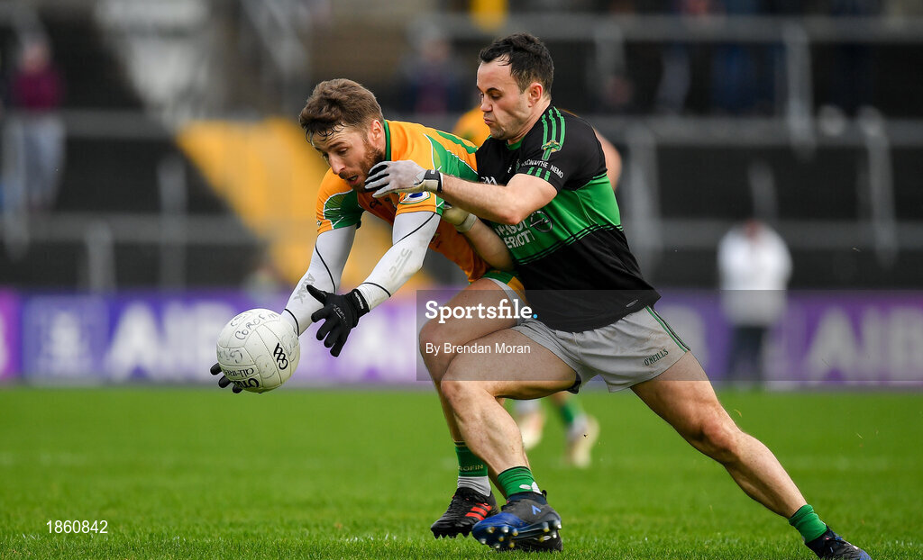 4 January 2020; Micheál Lundy of Corofin in action against Alan Cronin of Nemo Rangers during the AIB GAA Football All-Ireland Senior Club Championship semi-final match between Corofin and Nemo Rangers at Cusack Park in Ennis, Clare. Photo by Brendan Moran/Sportsfile