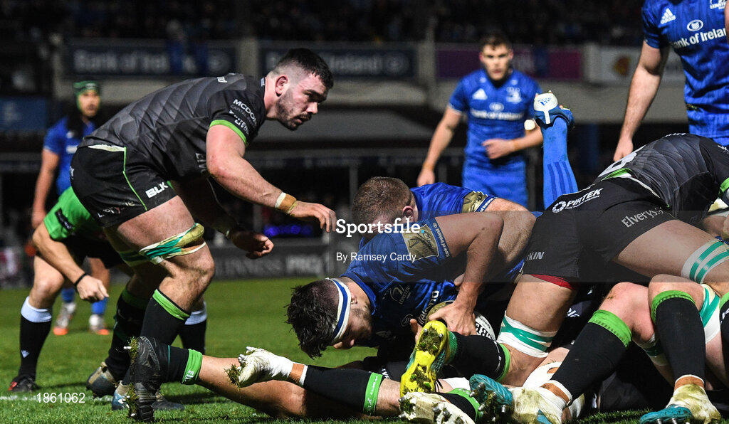 4 January 2020; Max Deegan of Leinster scores his side's sixth try during the Guinness PRO14 Round 10 match between Leinster and Connacht at the RDS Arena in Dublin. Photo by Ramsey Cardy/Sportsfile