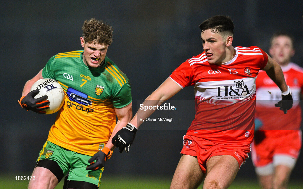 8 January 2020; Conor Morrison of Donegal in action against Ben McCarron of Derry during the Bank of Ireland Dr McKenna Cup Round 3 match between Derry and Donegal at Celtic Park in Derry. Photo by Oliver McVeigh/Sportsfile