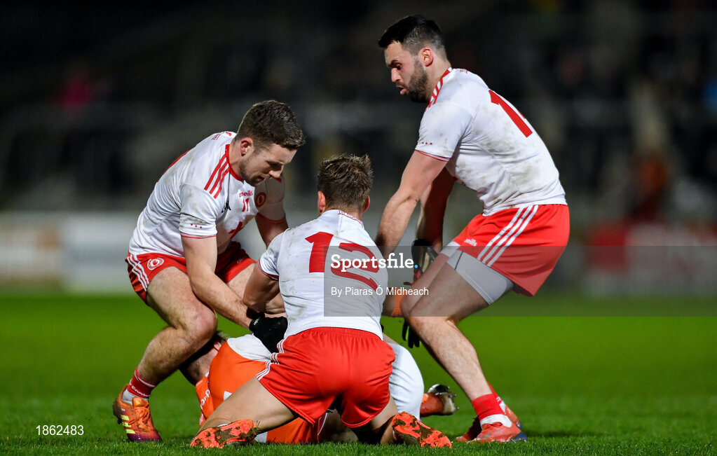 8 January 2020; Rian O'Neill of Armagh is tackled by Tyrone players, from left, Niiall Sludden, Frank Burns, and Kyle Coney during the Bank of Ireland Dr McKenna Cup Round 3 match between Armagh and Tyrone at Athletic Grounds in Armagh. Photo by Piaras Ó Mídheach/Sportsfile