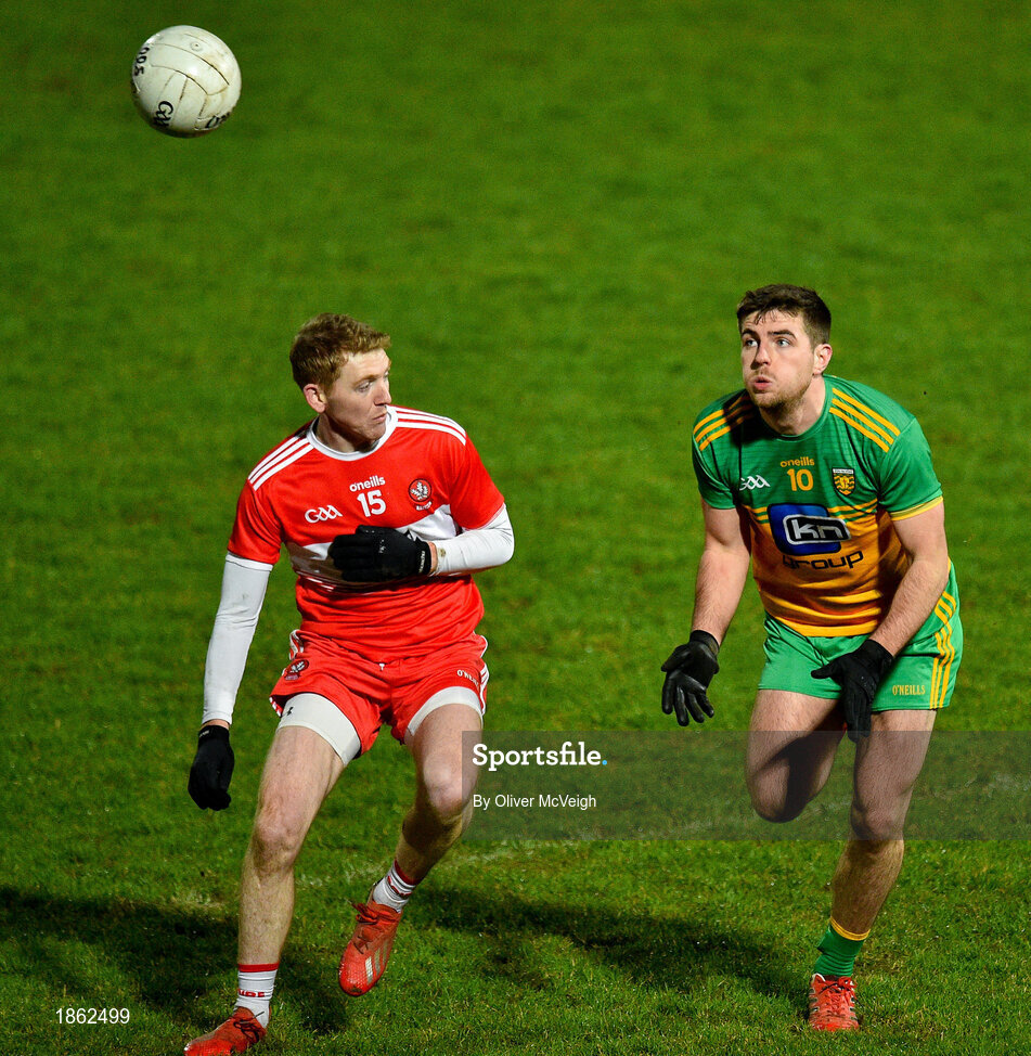 8 January 2020; Daire O'Baoill of Donegal in action against Christopher Bradley of Derry during the Bank of Ireland Dr McKenna Cup Round 3 match between Derry and Donegal at Celtic Park in Derry. Photo by Oliver McVeigh/Sportsfile