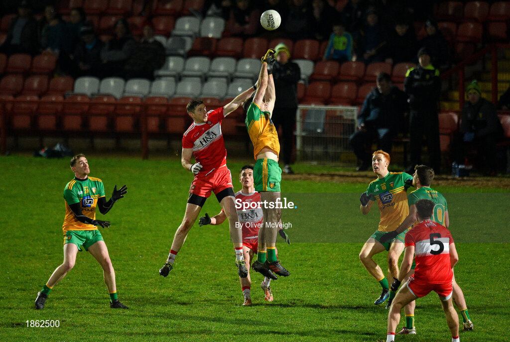 8 January 2020; Emmett Bradley of Derry in action against Paul Brennan of Donegal during the Bank of Ireland Dr McKenna Cup Round 3 match between Derry and Donegal at Celtic Park in Derry. Photo by Oliver McVeigh/Sportsfile