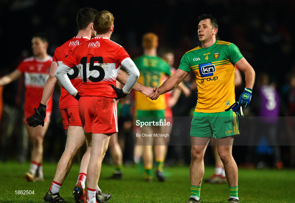 8 January 2020; Ben McCarron of Derry and Paul Brennan of Donegal exchange handshakes after the Bank of Ireland Dr McKenna Cup Round 3 match between Derry and Donegal at Celtic Park in Derry. Photo by Oliver McVeigh/Sportsfile