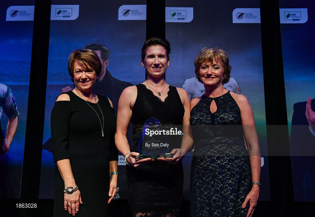 10 January 2020; Michelle O'Neill is presented with her Liam Tuohy Special Merit award by Geradine O'Sullivan, left, and Patricia Craddock, daughters of Liam Tuohy, during the SSE Airtricity / Soccer Writers Association of Ireland Diamond Jubilee Personality of the Year Awards 2019 at the Clayton Hotel in Dublin. Photo by Seb Daly/Sportsfile