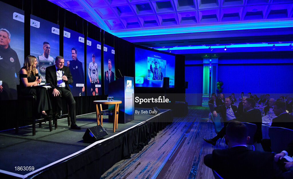 10 January 2020; Former Republic of Ireland International Packie Bonner in conversation with MC Marie Crowe after being presented with his International Achievement Award during the SSE Airtricity / Soccer Writers Association of Ireland Diamond Jubilee Personality of the Year Awards 2019 at the Clayton Hotel in Dublin. Photo by Seb Daly/Sportsfile