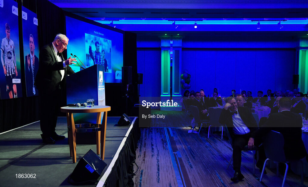 10 January 2020; Charlie Stuart speaking during the SSE Airtricity / SWAI Diamond Jubilee Personality of the Year Awards 2019 at the Clayton Hotel in Dublin. Photo by Seb Daly/Sportsfile