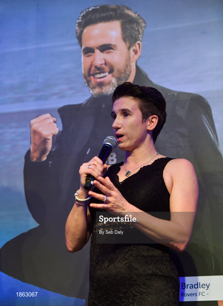 10 January 2020; Michelle O'Neill on stage after winning the Liam Tuohy Special Merit award during the SSE Airtricity / Soccer Writers Association of Ireland Diamond Jubilee Personality of the Year Awards 2019 at the Clayton Hotel in Dublin. Photo by Seb Daly/Sportsfile