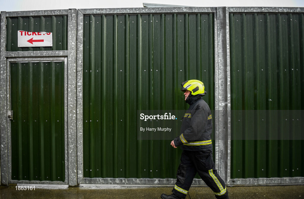 11 January 2020; Member of the Fire Service Noel Mannion attempts to gain access to the stadium after an alarm was triggered prior to the O'Byrne Cup Semi-Final match between Offaly and Westmeath at Bord na Móna O'Connor Park in Tullamore, Offaly. Photo by Harry Murphy/Sportsfile