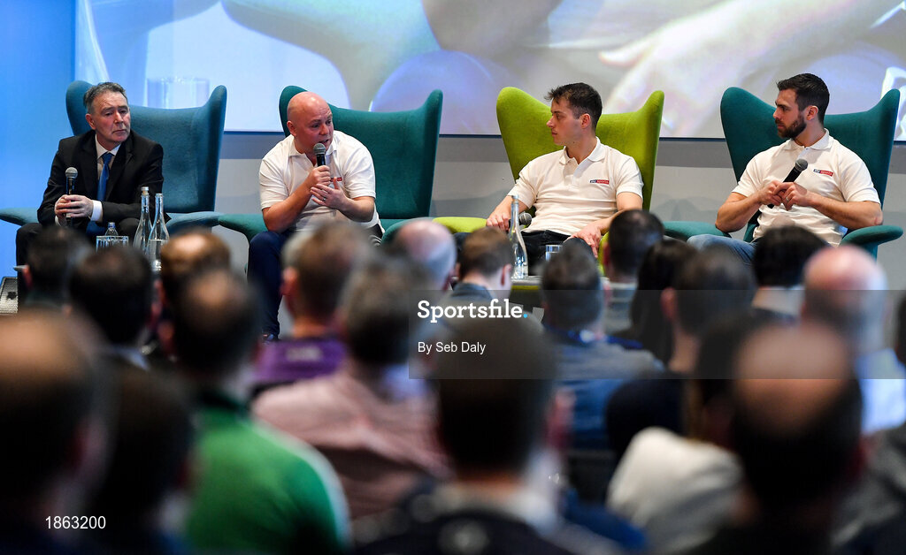 11 January 2020; In conversation during a panel discussion are, from left, Kevin Moran, Doctor, Donegal Senior Football Team, Derek McGrath, Sky Sports Ambassador, Former Waterford Senior Hurling manager, Paul Broderick, Sky Sports Ambassador, Carlow Senior Footballer, and Neil McManus, Sky Sports Ambassador, Antrim Senior Hurler, at the GAA Games Development Conference, in partnership with Sky Sports, which took place in Croke Park on Friday and Saturday. A record attendance of over 800 delegates were present to see over 30 speakers from the world of Gaelic games, sport and education. Photo by Seb Daly/Sportsfile
