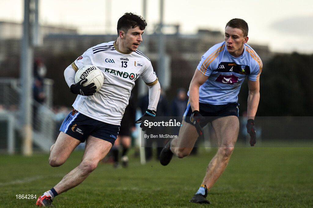 12 January 2020; Lee Brennan of UU Jordanstown in action against Martin O'Connor of UCD during the Sigerson Cup Round 1 between UCD and UU Jordanstown at UCD Billings Park in Belfield, Dublin. Photo by Ben McShane/Sportsfile