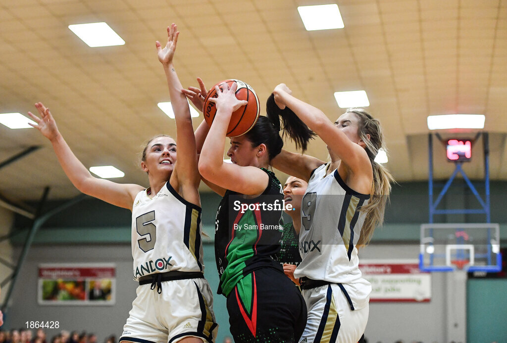 12 January 2020; Jade Daly of Trinity Meteors in action against Brianna Mulhern, left, and Nichola Rafferty of Ulster University during the Hula Hoops Women's Division One National Cup Semi-Final between Ulster University and Trinity Meteors at Parochial Hall in Cork. Photo by Sam Barnes/Sportsfile