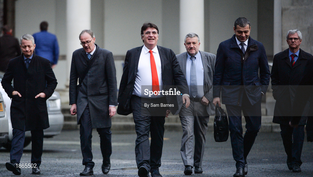 14 January 2020; UEFA Deputy Director of National Associations theirry Favre, FAI Chairman Roy Barrett, UEFA General Secretary Theodore Theodoridis, FAI Executive Lead Paul Cooke, UEFA Director of National Associations Zoran Lakovic, and UEFA Financial Director Josef Koller leave Leinster House following the UEFA meeting with the Department of Transport, Tourism and Sport at Leinster House in Dublin. Photo by Sam Barnes/Sportsfile