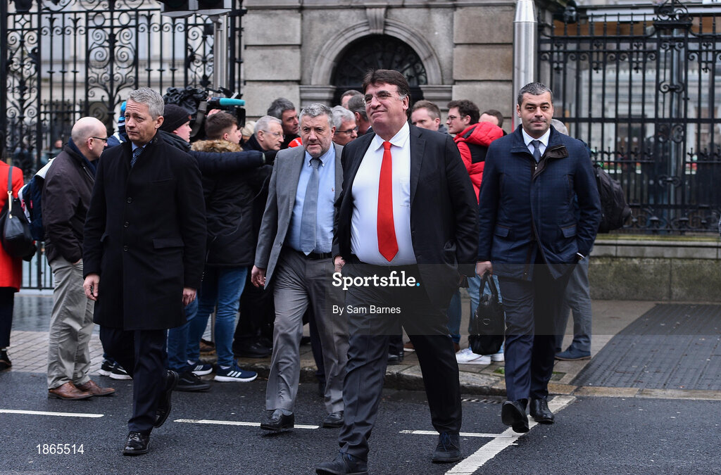 14 January 2020; UEFA Deputy Director of National Associations theirry Favre, FAI Executive Lead Paul Cooke, UEFA General Secretary Theodore Theodoridis, and UEFA Director of National Associations Zoran Lakovic leave Leinster House following the UEFA meeting with the Department of Transport, Tourism and Sport at Leinster House in Dublin. Photo by Sam Barnes/Sportsfile