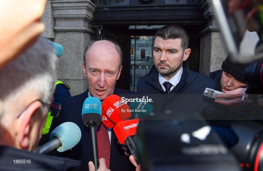 14 January 2020; Minister for Transport, Tourism and Sport Shane Ross T.D., left, and Minister of State for Tourism and Sport Brendan Griffin T.D, speak to members of the media following the UEFA meeting with the Department of Transport, Tourism and Sport at Leinster House in Dublin. Photo by Sam Barnes/Sportsfile
