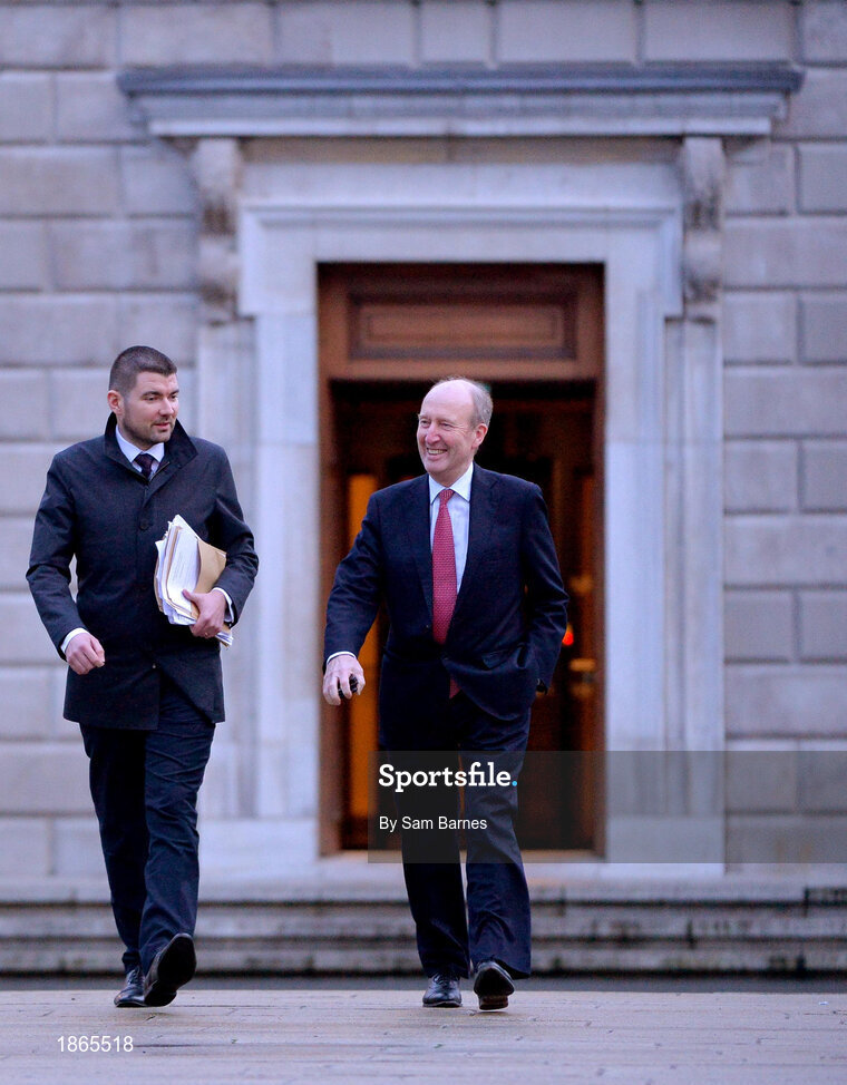 14 January 2020; Minister for Transport, Tourism and Sport Shane Ross T.D., right, and Minister of State for Tourism and Sport Brendan Griffin T.D, leave Leinster House following the UEFA meeting with the Department of Transport, Tourism and Sport at Leinster House in Dublin. Photo by Sam Barnes/Sportsfile