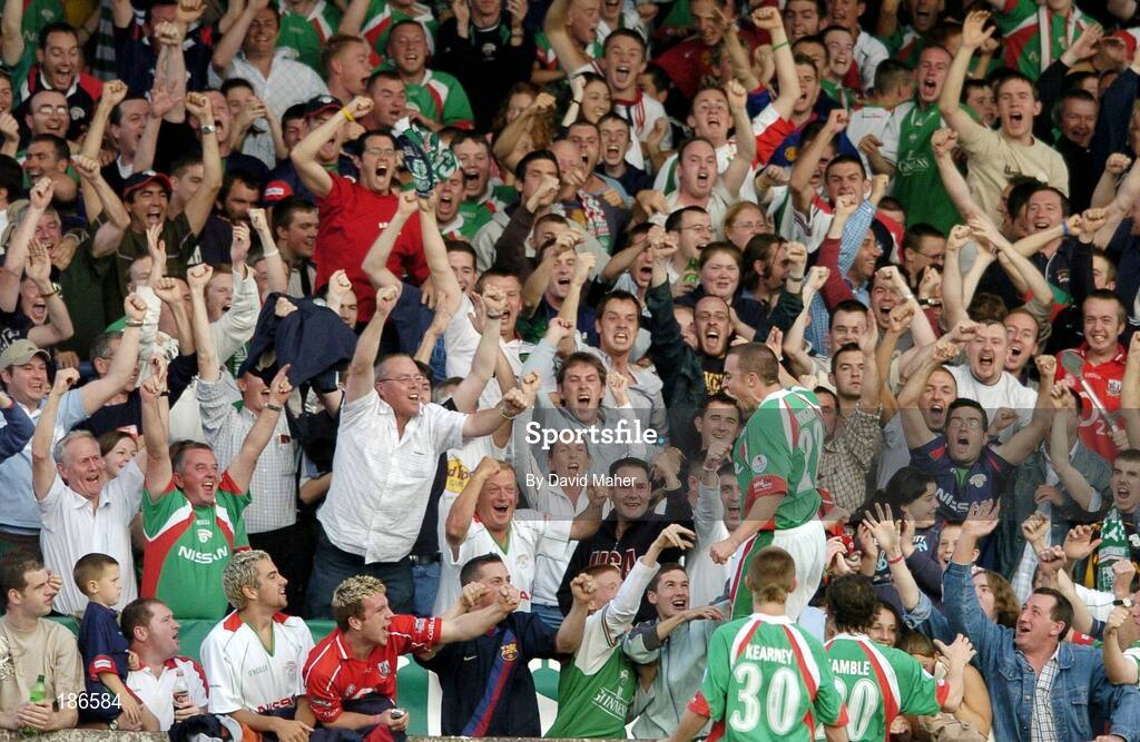 15 August 2005; Neal Horgan, no.22, Cork City, celebrates after scoring his sides first goal with supporters and team-mates Liam Kearney and Joe Gamble. eircom League, Premier Division, Cork City v Shelbourne, Turners Cross, Cork. Picture credit; David Maher / SPORTSFILE
