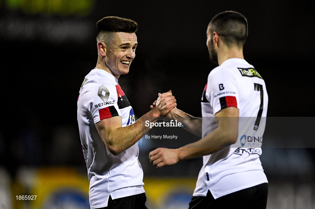 17 January 2020; Darragh Leahy of Dundalk celebrates after scoring his side's sixth goal with team-mate Michael Duffy during the Pre-Season Friendly match between Dundalk and UCD at Oriel Park in Dundalk, Co. Louth. Photo by Harry Murphy/Sportsfile