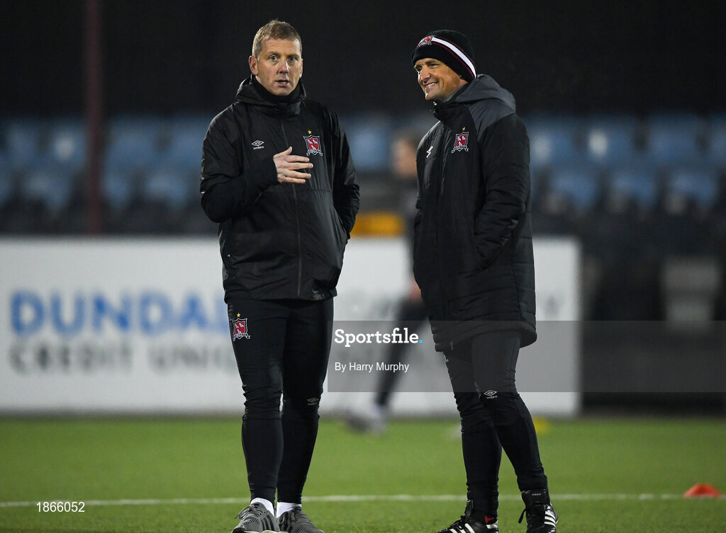 17 January 2020; Dundalk head coach Vinny Perth, left, speaks with Dundalk physiotherapist Danny Miller prior to the Pre-Season Friendly match between Dundalk and UCD at Oriel Park in Dundalk, Co. Louth. Photo by Harry Murphy/Sportsfile