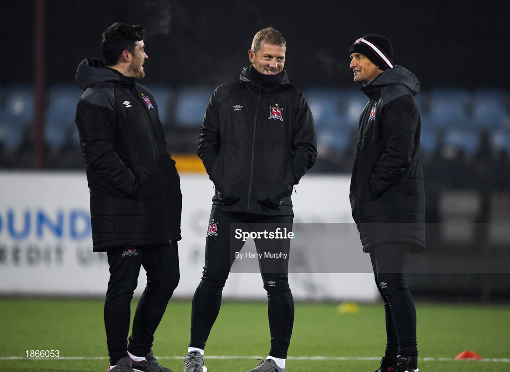 17 January 2020; Dundalk head coach Vinny Perth, centre, speaks with Dundalk physiotherapists David Murphy, left, and Danny Miller, right, prior to the Pre-Season Friendly match between Dundalk and UCD at Oriel Park in Dundalk, Co. Louth. Photo by Harry Murphy/Sportsfile