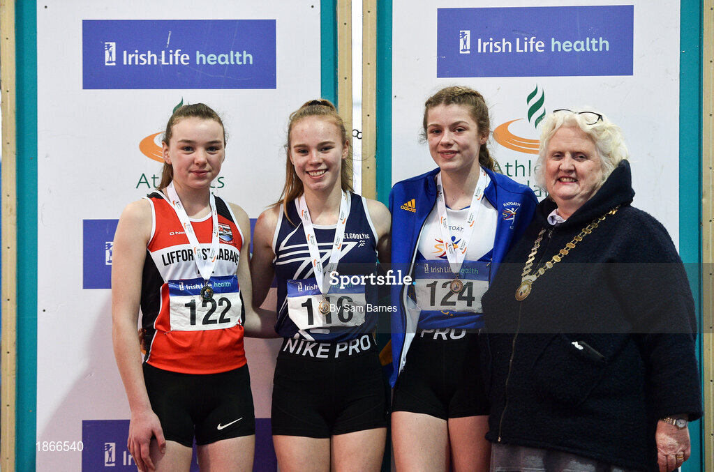 18 January 2020; Athletics Ireland President Georgina Drumm, right, with U15 Women's combined events medallists, from left, Ashleigh Mcardle of Lifford Strabane A.C., Co. Donegal, silver, Hannah Falvey of Belgooly A.C., Co. Cork, gold, and Cara O'Sullivan of Ratoath A.C., Co. Meath, bronze, during the Irish Life Health Indoor Combined Events All Ages at Athlone International Arena, AIT in Athlone, Co. Westmeath. Photo by Sam Barnes/Sportsfile