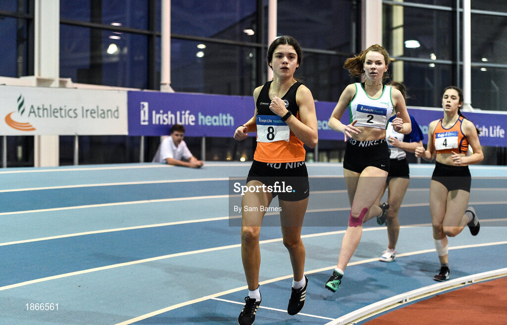 18 January 2020; Grainne O'Sullivan of Bray Runners A.C., Co. Wicklow, competing in the 800m event in the Youth Women's combined events during the Irish Life Health Indoor Combined Events All Ages at Athlone International Arena, AIT in Athlone, Co. Westmeath. Photo by Sam Barnes/Sportsfile