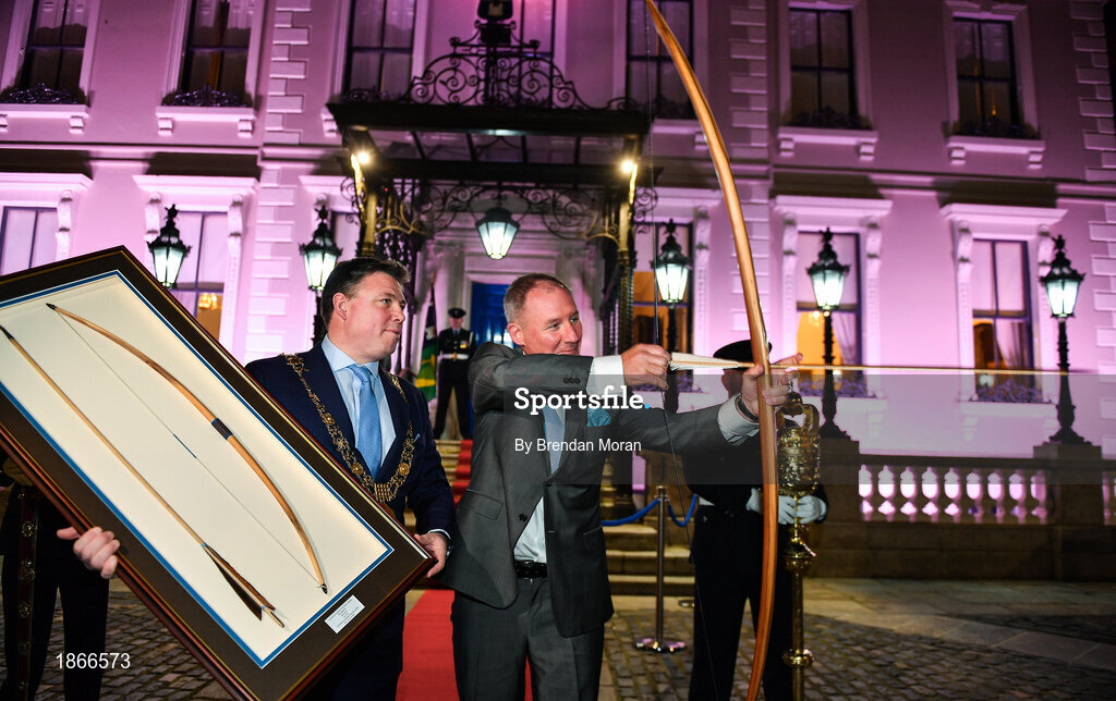 18 January 2020; Former Dublin GAA football team manager Jim Gavin, right, with Lord Mayor of Dublin Paul McAuliffe, at the Conferring of the Honorary Freedom of Dublin City on Jim Gavin ceremony in the Round Room at the Mansion House, in Dawson St, Dublin. Photo by Brendan Moran/Sportsfile
