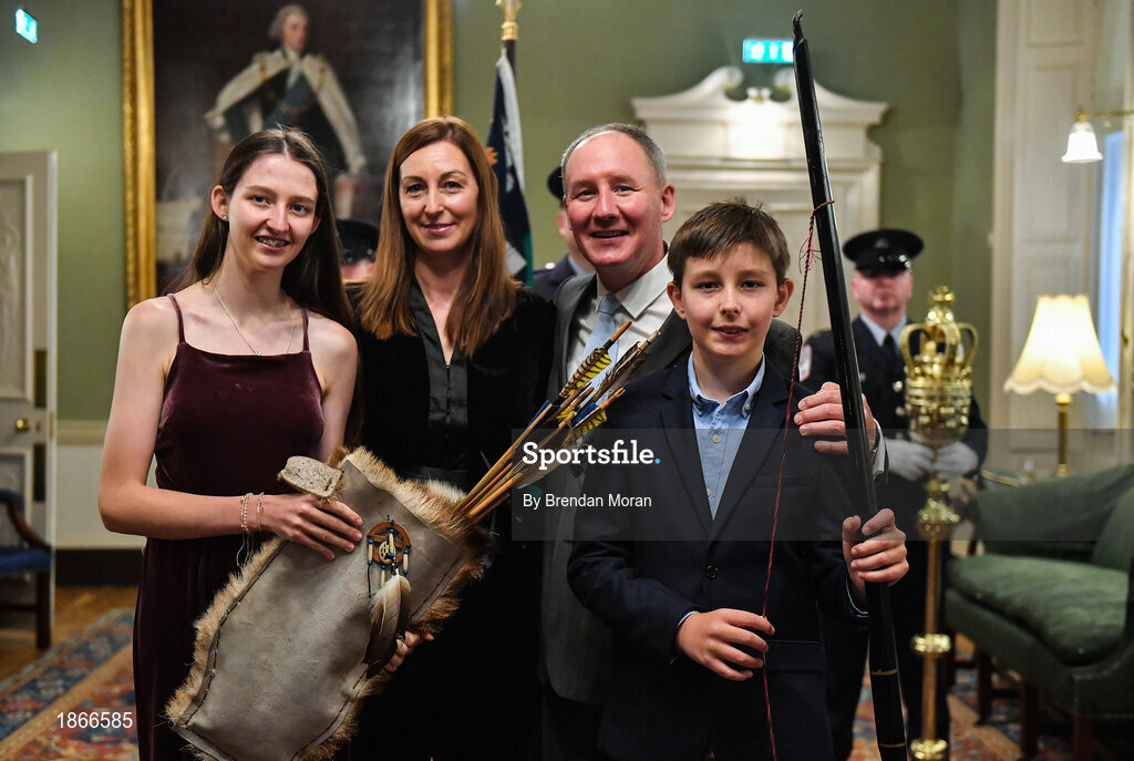 18 January 2020; Former Dublin GAA football team manager Jim Gavin, second from right, with his wife Jennifer, son Jude and daughter Yasmin, at the Conferring of the Honorary Freedom of Dublin City on Jim Gavin ceremony in the Round Room at the Mansion House, in Dawson St, Dublin. Photo by Brendan Moran/Sportsfile
